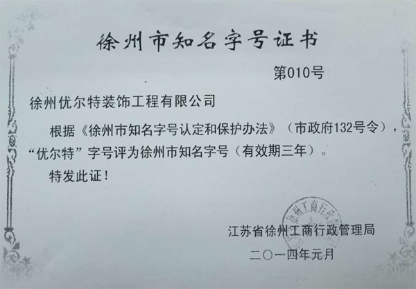 優(yōu)爾特裝飾被徐州市政府、工商管理局命名認(rèn)定為徐州市第一批知名字號(hào)