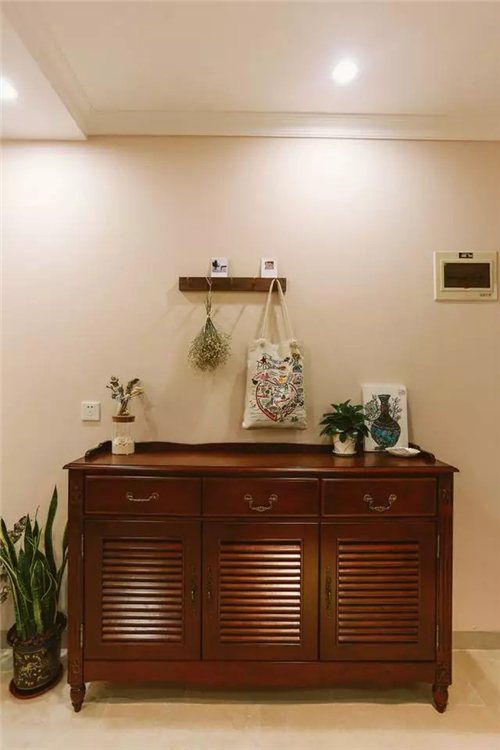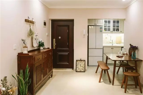門口的櫥柜是木質(zhì)的,與餐桌椅的風格比較搭。餐桌比較簡單,太大的話會顯得空間比較擁擠。